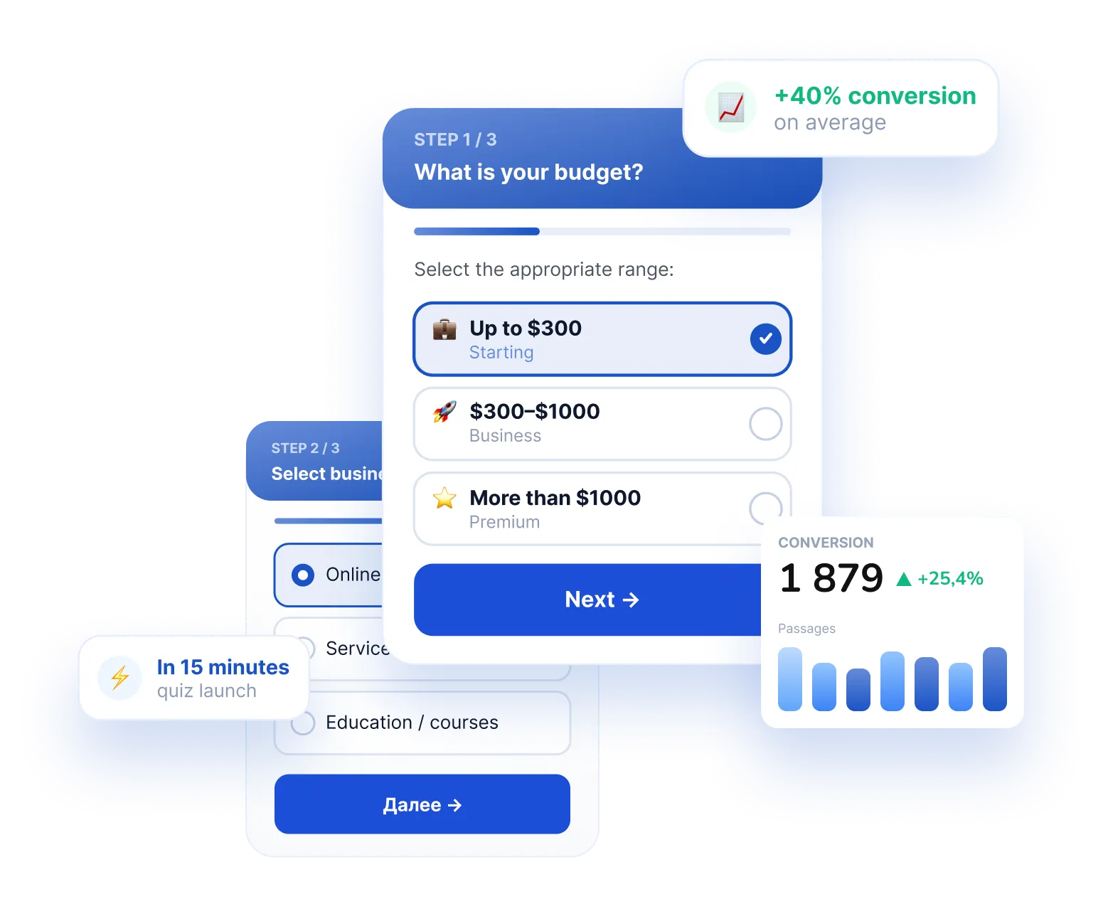 Квиз можно использовать как сценарий подбора: по ответам пользователя система помогает сегментировать аудиторию и предлагать более точное решение.