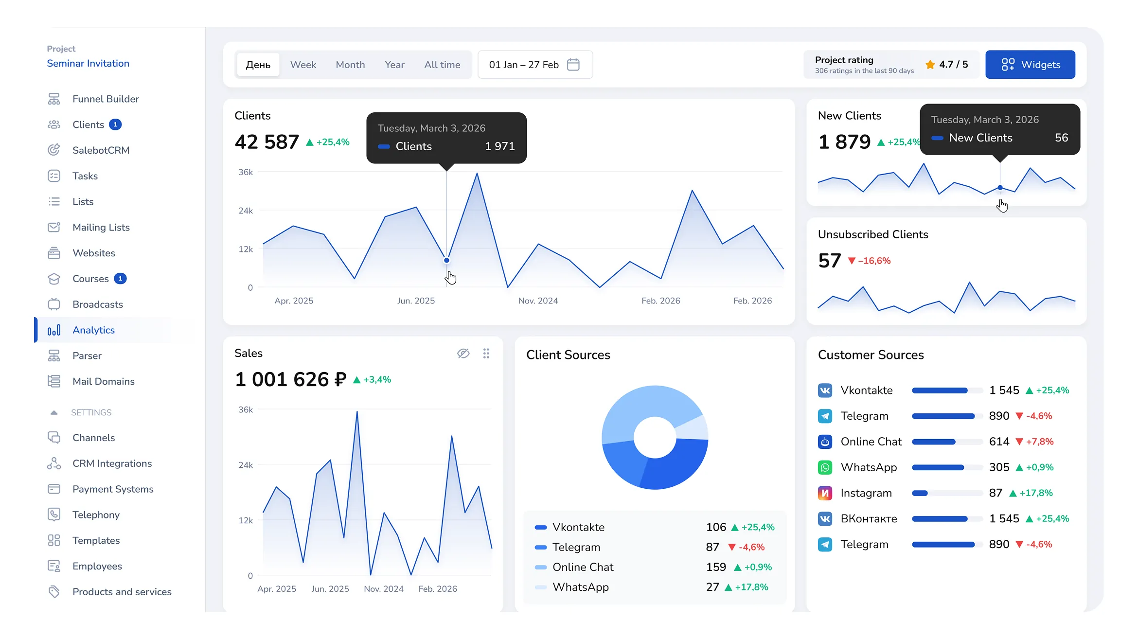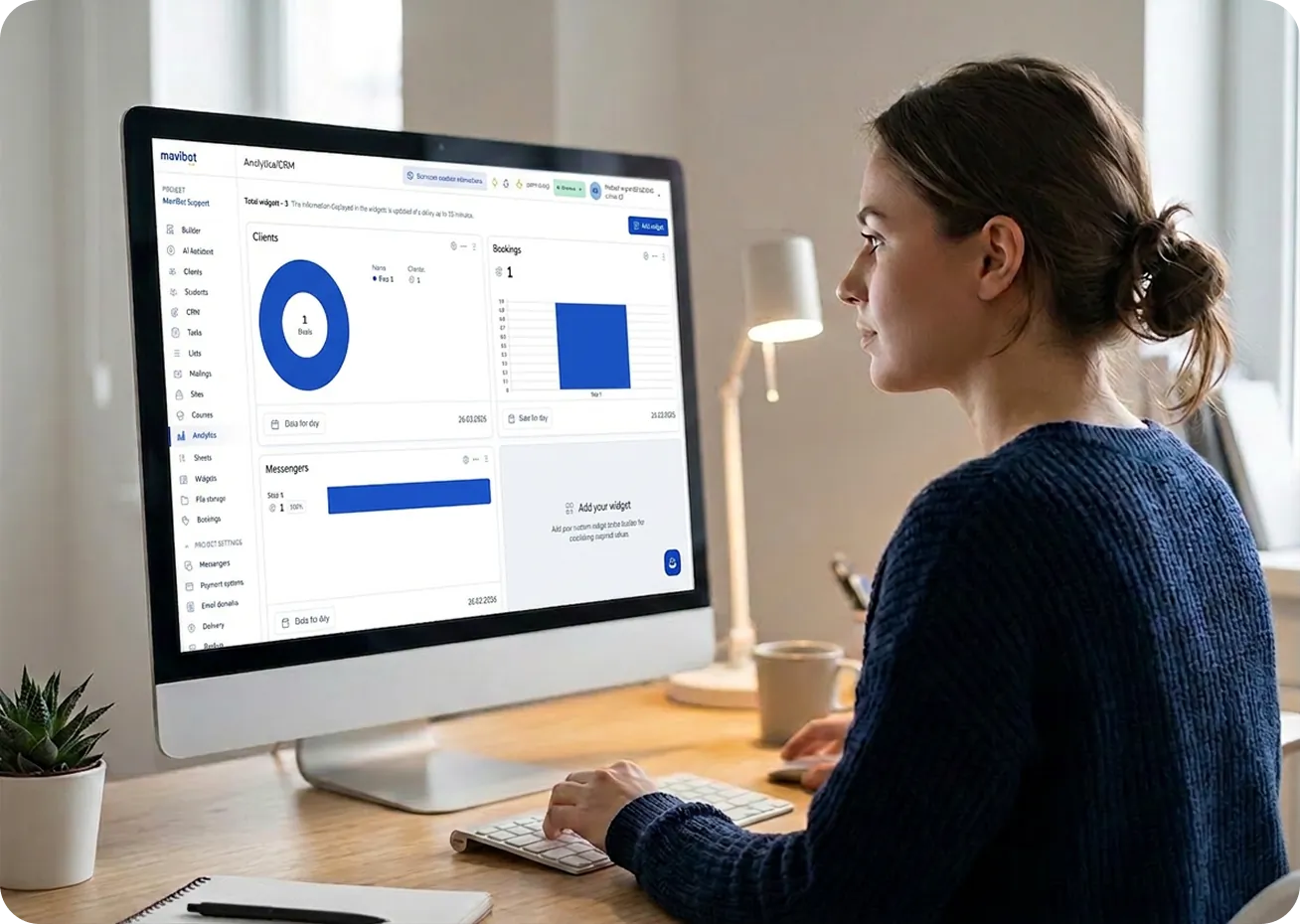 CRM, online booking, chatbots and broadcasts are combined in one system — no need to switch between services