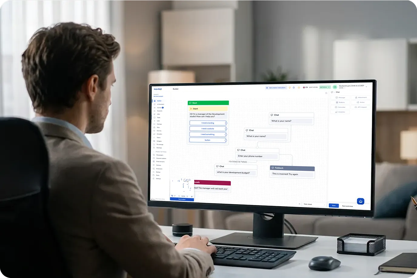 En el constructor de Mavibot crea bloques, botones, flechas y añade imágenes, videos y carruseles.